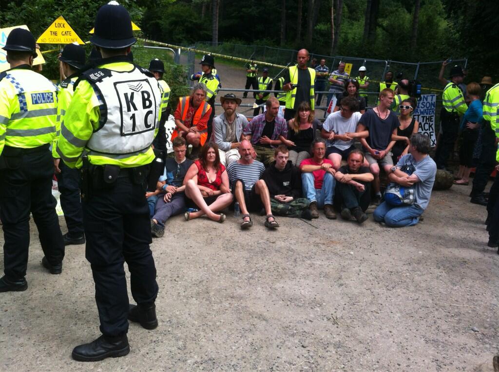 Update (1:50pm): Arrests allegedly under Trade Union and Labour Relations Act 1992 – Sec. 241. Apparently the frackers were being “beset and intimidated” by the community! The people of Balcombe would say it was the was the other way round!