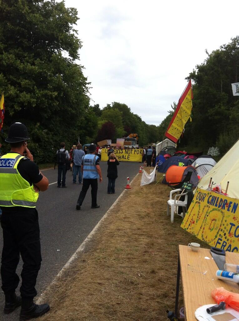 Fracking company Cuadrilla Resources are trying to start drilling in Balcombe, West Sussex and the community is trying to stop them. Over 250 people stopped 15 trucks bring on equipment on Day 1 (Thurs). On Day 2 more than 100 police were used to break the blockade and escort trucks onto the fracking site. On Day 3 the community continued to resist attempts to force trucks through the blockade but gave up early afternoon. On Day 4 Cudrilla did not attempt to bring any trucks onto the site. On Day 5 Cuadrilla continued to try to push trucks through the blockade and the community have continued to resist. Camp is still going strong and renewed efforts are being made to defend Balcombe. See Fracking In Balcombe: A Community Says No for background to issues involved. Scroll down for photos.